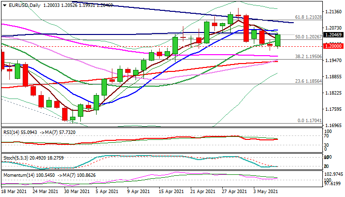 Upticks should be ideally capped by 100DMA / Fibo 38.2% of 1.2149/1.1985 pullback (1.2048) to keep bears from 1.2149 (Apr 29 high) intact.