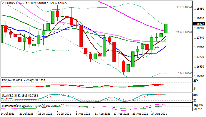 Fresh strength penetrated thick daily cloud (base lays at 1.1832), with close within the cloud to confirm bullish signal and open way for extension towards key barriers at 1.1900 zone (Fibo 38.2% of 1.2266/1.1664 descend / July 30 high) violation of which would confirm reversal signal.