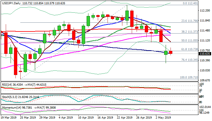 Monday’s gap remains unfilled, keeping near-term bias with bears, as negative signals were boosted by close below important Fibo support at 110.73 (61.8% of 109.71/112.40 rally).