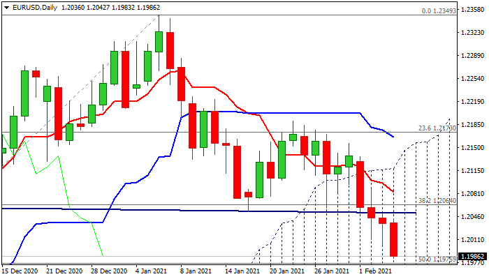 Bears pressure immediate support at 1.1975 (50% retracement of 1.1602/1.2349 advance), with more significant 1.1956 level (daily cloud base / 100DMA) being also in focus.