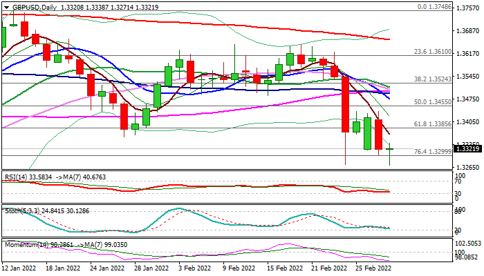 Cable probed below 1.33 mark and cracked 2022 low (1.3272) posted on Feb 24 when war in Ukraine started but failed to sustain break and holding above pivotal 1.33 level (Fibo 76.4% of 1.3161/1.3748) so far.