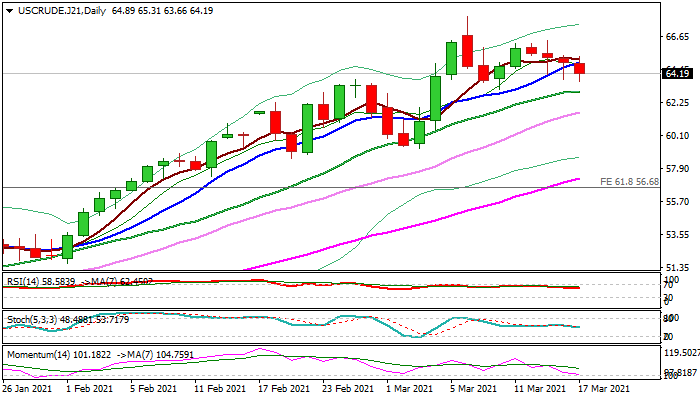 Larger bull-leg from $33.61 (Nov 2 trough) is currently on hold and consolidating under new recovery high at $67.95 (Mar 8 peak, the highest since Oct 2018), as traders collected some profits and overbought weekly studies signaled a pause ahead of attack at psychological $70 barrier.