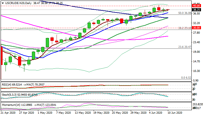 Consolidation so far holds above rising 10DMA ($36.89) keeping bullish bias, but drop and close below the indicator would generate negative signal and risk test of converged 20/100DMA’s ($34.56), loss of which would open way for deeper correction.