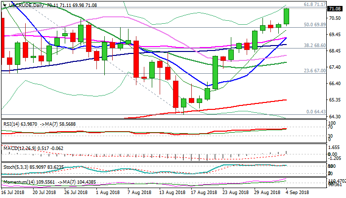 Fresh advance pressures pivotal barrier at $71.17 (Fibo 61.8% of $75.34/$64.43 descend), break of which is needed for another bullish signal.