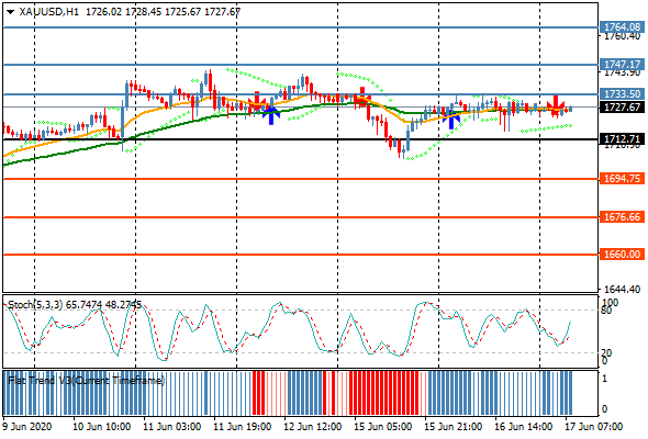 و يتداول المعدن اليوم بإيجابية اعلى من أعلى نقطته المحورية 1712 ، ويتداول اعلى المتوسطات السعرية 20 55 ، و من تداوله أعلى مستوى 61.8 فيبوناتشي ( للموجة الهابطة من 1790 بتاريخ أكتوبر 2012) , و من ايجابية السعر على مؤشر الستوكاستك بتقاطع خطوطه لاعلي ,ومن ايجابية الزوج على مؤشر السار ,وعلى الرغم من سلبيته على مؤشر الإي إم أيه ,و لكن إيجابيته على مؤشر الفلات ترند ولذلك نرجح الإتجاه الصاعد اليوم