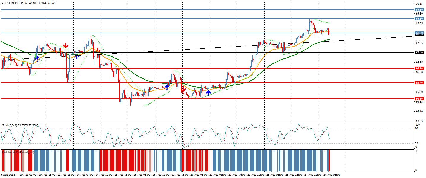 تداول النفط في حدود 55 نقطة مع إتجاه عام هابط حيث إفتتح عند 68.57 و أغلق عند 68.44 و وصل لاعلى سعر عند 68.77 وأدنى سعر للنفط عند 68.42 و نجح النفط في الثبات أعلى نقطته المحورية عند 67.40