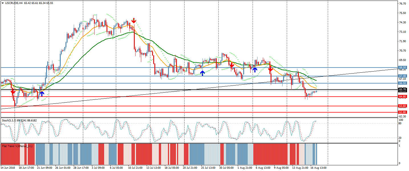 ويتداول النفط اليوم بسلبية أسفل من نقطتة المحورية 65.70 و أسفل المتوسطات السعرية 20 55 , وعلى الرغم من تداوله اعلى مستوى 61.8 فيبوناتشي ( للموجة الهابطة من 62.30 بتاريخ مايو2015 ) , و من سلبية السعر على مؤشر الستوكاستك بتقاطع خطوطه لأسفل و من سلبية الزوج على مؤشر السار و سلبيته على مؤشر الإي إم أيه , و إيجابية على مؤشر الفلات ترند و تجعلنا نرجح الاتجاه الهابط اليوم