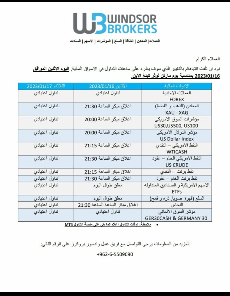 وتغلق البنوك الأمريكية أبوابها اليوم احتفالاً بيوم “مارتن لوثر كينج جونيور”، ولذلك سنشهد اليوم إغلاقات مبكّرة لعديد من الأصول المتداولة في الأسواق المالية كما يوضّح الجدول أدناه: