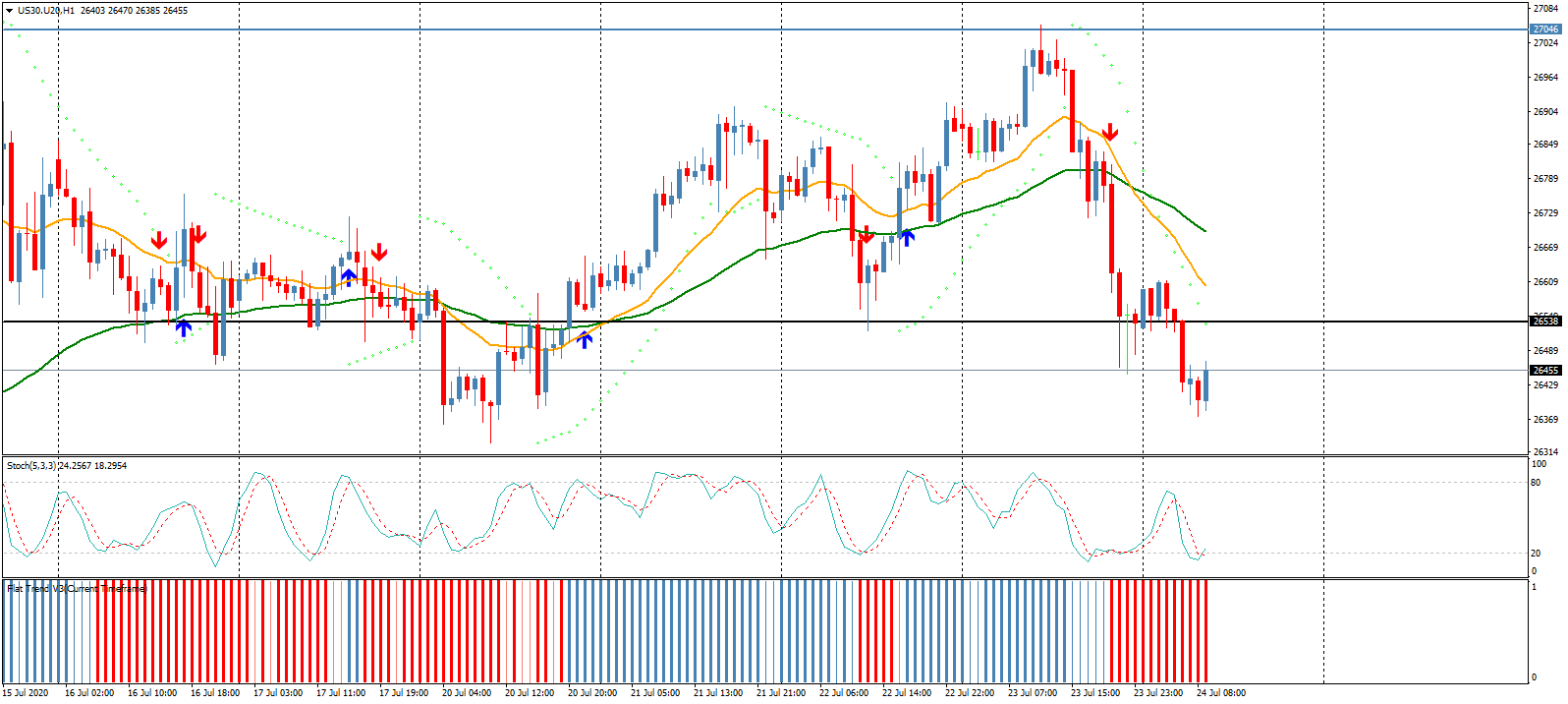 كما يظهر على الشارت فشل مؤشر الداو جونز في كسر نقطته الهامة عند 27040 وسرعان ما إرتد وكسر نقطته المحورية عند 26540 مما زاد الذغوط عليه بجانب سلبية المؤشر على كل المؤشرات الفنية وتقاطع المتوسطات السعرية لأسفل ولذلك مزيد من الهبوط للمؤشر هو المتوقع