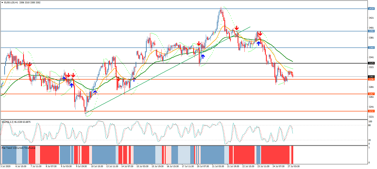 وتعليقا منا على ذلك كما نرى الأداء السلبي على مؤشر يورو ستكوكس بعد كسره لخط الإتجاه الصاعد بالإضافة للأداء السلبي على كل المؤشرات خصة تقاطع المتوسطات السعري لاسفل وثبات السعر أسفلهم بجانب ثباته اسفل نقطته المحورية عند3329 ولذلك نتوقع مزيد من الأداء السلبي الذي من الممكن أن يصل إلى 3232 بشرط كسر 3296