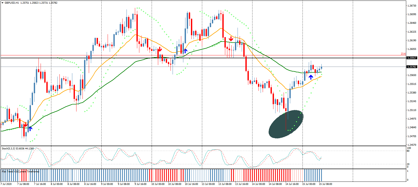 يتضح من الرسم البياني نقطة التحول عل مدار اليوم للجنيه البريطاني مقابل الدولار الأمريكي وإرتداده من 1.2480 وتكوينه لشمعة الأرجل الطويلة العاكسة للإتجاه مما حول الاداء كليا ودعم الإتجاه الصاعد الإيجابية الواضحة على أغلب المؤشرات منها تقاطع خطوط الستوكاستك لأعلى وثبات السعر أعلى المتوسطات السعرية
