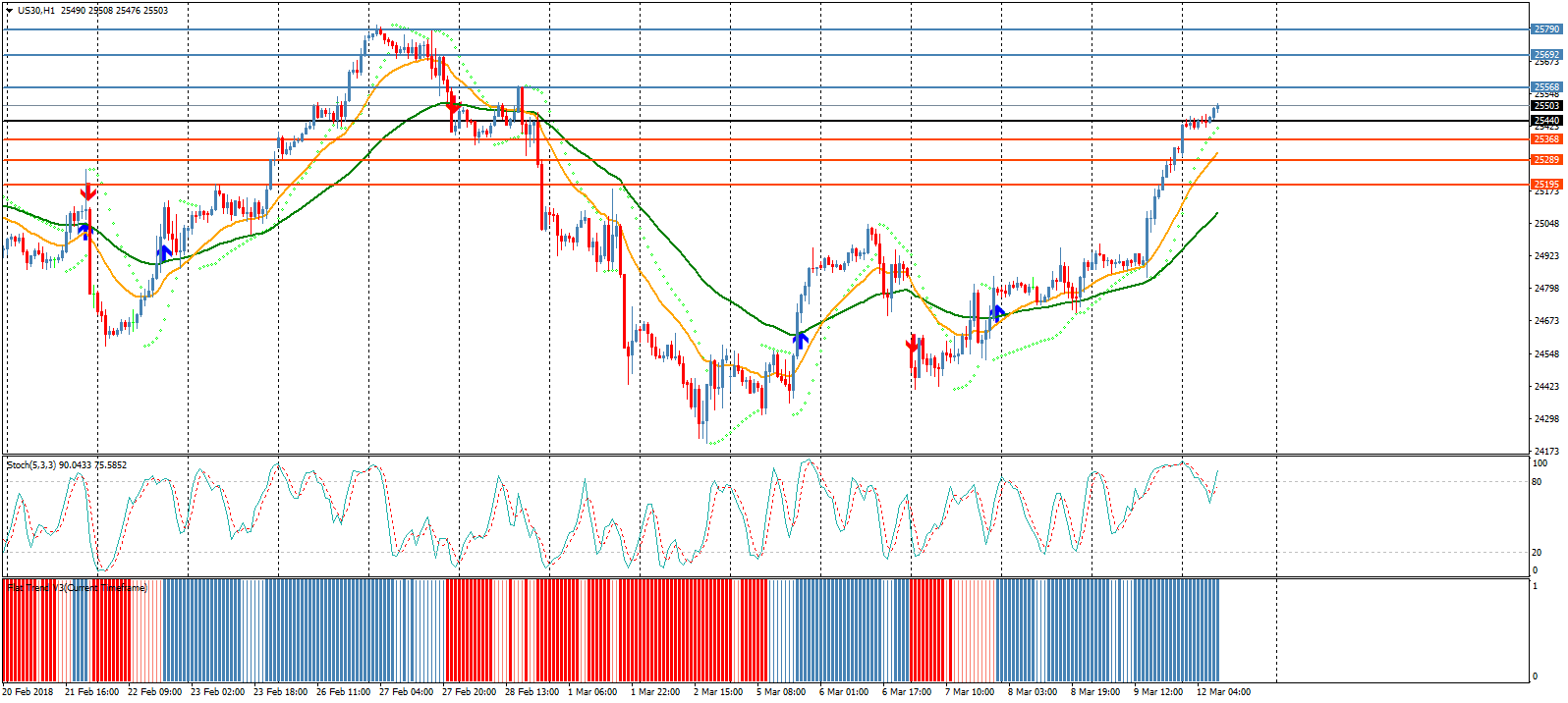 تداول مؤشر الداو جونز في حدود 500 نقطة مع إتجاه عام صاعد فبدأ عند 24872 و أغلق عند 25335 و وصل لأعلي سعر عند 25344 كان أدني سعر للداو جونز عند 24855 و نجح المؤشر في تحقيق مستهدفه الثاني عند 25200