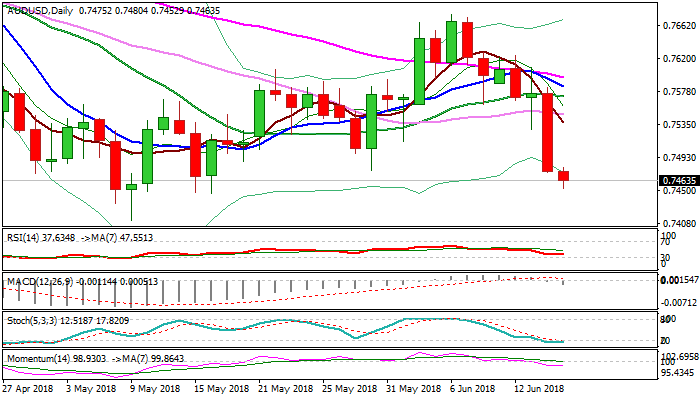 Loss of psychological 0.75 handle opened way for test of key support at 0.7412 (2018 low, posted on 09 May), loss of which would signal continuation of downtrend from 2018 high at 0.8135 and expose next significant support at 0.7325 (Fibo 61.8% of 0.6825/0.8135 2016/2018 rally).
