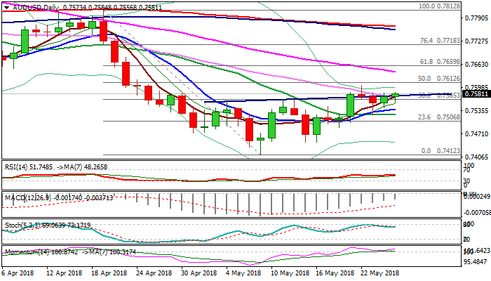 Initial barrier lies at 0.7605 (22 May high), break of which would expose 0.7642 (falling 55SMA) and 0.7660 (Fibo 61.8% of 0.7812/0.7412 fall).