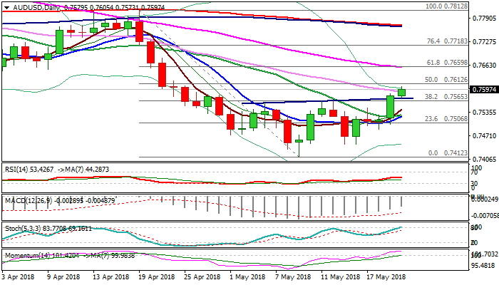 Strong bullish momentum and double bull-cross (5/20 & 10/20SMA) underpin recovery which pressures barrier at 0.7612 (daily Kijun-sen / 50% retracement) and may extend towards next key points at 0.7642/60 zone (weekly cloud base / 29 Mar former low / Fibo 61.8% of 0.7812/0.7412 / falling 55SMA), break of which would confirm reversal.