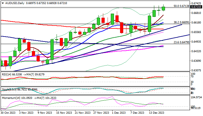 Bulls regained traction after brief pause on Friday, shaped in a long-legged Doji candle and probe again through important Fibo barrier at 0.6713 (50% retracement of 0.7157/0.6270 downtrend).