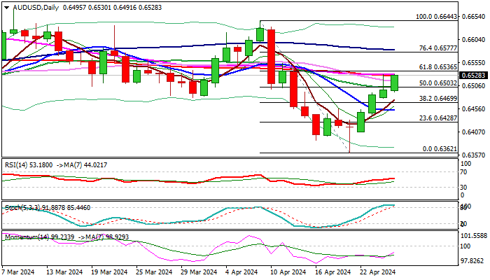 Aussie dollar was boosted by hotter than expected Australia’s inflation and keeps bullish sentiment, however, reaction at key barriers at 0.6526/36 zone (converged 200/55DMA’sc / Fibo 61.8% of 0.6644/0.6362 bear-leg) is likely to define near-term direction.