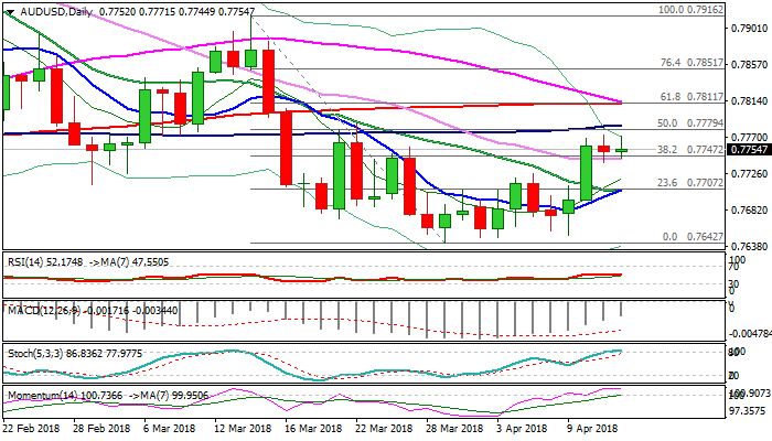Strong barrier, provided by 100SMA (0.7784) keeps the upside limited, with break here and nearby 200SMA (0.7811) needed to generate stronger bullish signal for extension of recovery from the 0.7640 base.