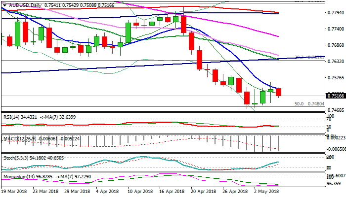 Alternatively, firm break above 10SMA would sideline immediate downside risk and expose next pivotal barrier at 0.7602 (Fibo 38.2% of 0.7812/0.7472 descend).