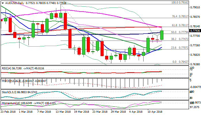 Bulls pressure pivotal barrier at 0.7811 (Fibo 61.8% of 0.7916/0.7642 descend / falling 200SMA) and turn focus towards strong barrier at 0.7834 (base of thickening daily cloud).