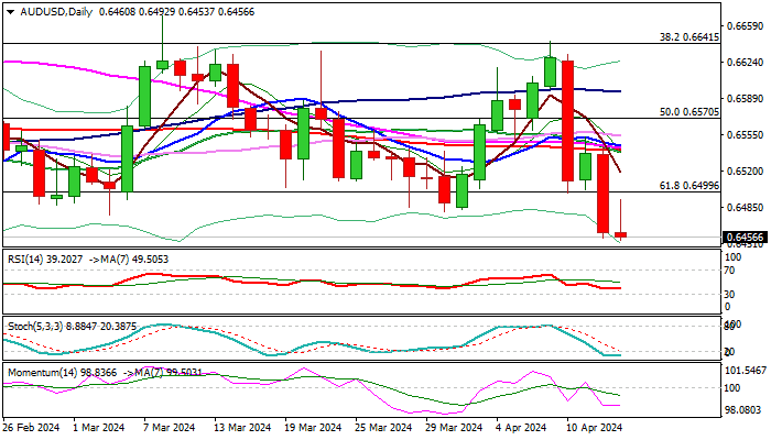 Near-term focus remains at the downside, as bears eye targets at 0.6442 (2024 low, posted on Feb 13) and 0.6411 (Fibo 76.4% of 0.6270/0.6871 rally), violation of which would open way for full retracement of 0.6270/0.6871 move.