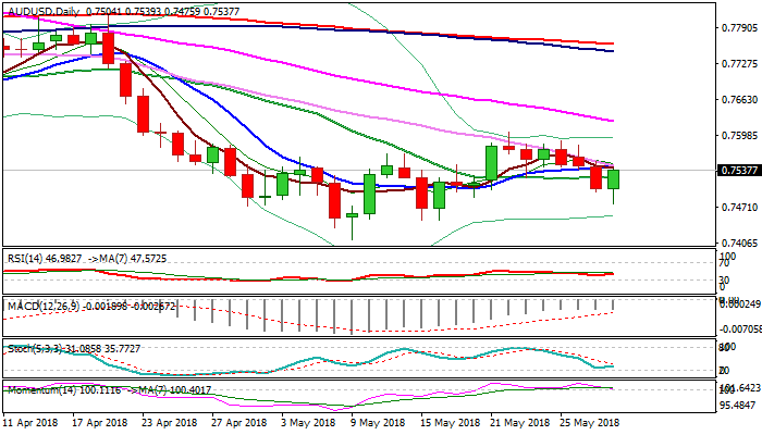 Fresh recovery was supported by weaker greenback and probes above initial pivots at 0.7525 (Fibo 38.2% of 0.7605/0.7475 / 4-hr cloud base), pressuring key barriers at 0.7540 zone (converged 10/30SMA’s).