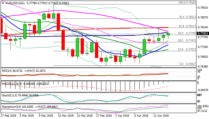 Rising momentum and bullish setup of 10/20/30SMA’s support recovery from 0.7640 base, but limited upside action could be expected while 200SMA caps as widening daily cloud (spanned between 0.7827 and 0.7923) continues to weigh.