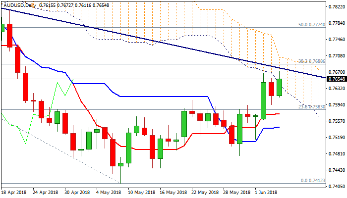 Bulls pressure next pivotal barriers at 0.7675 (bear-trendline drawn off 0.7988, 6 Feb high) and 0.7688 (Fibo 38.2% of 2018 0.8135 / 0.7412 fall), break of which confirm strong bullish signal for continuation of recovery leg from 0.7412 low.