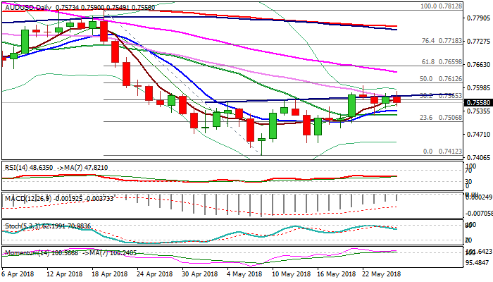 Stronger bearish acceleration and violation of pivotal supports at 0.7536 /22 (10 / 20SMA, also Fibo 38.2% of 0.7412/0.7605 recovery) would confirm bearish bias and signal formation of lower top (0.7506).
