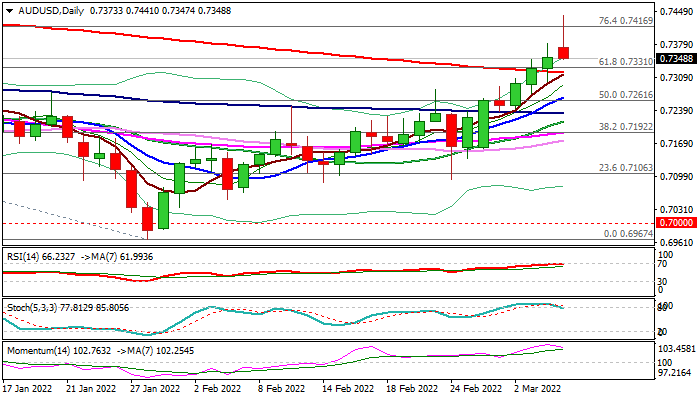 Fresh advance probed above pivotal level at 0.7416 (Fibo 76.4% of 0.7555/0.6967 / 55WMA) but so far lacking strength for a firm break higher that would generate strong bullish signal.