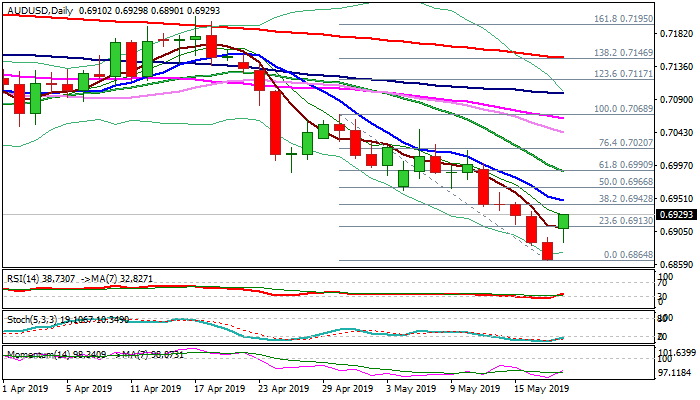 Recovery from new 4 ½ month low at 0.6864 broke above initial resistance at 0.6910 (5SMA and eyes more significant barriers at 0.6942/48 (Fibo 38.2% of 0.7068/0.6864 / falling 10SMA) break of which would signal stronger recovery.