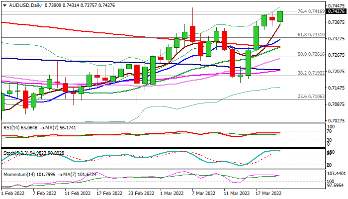 Bullish setup of daily MA and strong positive momentum support the action, with initial supports at 0.7365/50 zone) and broken Fibo 6.8% (0.7331) expected to contain potential dips and keep bulls in play.