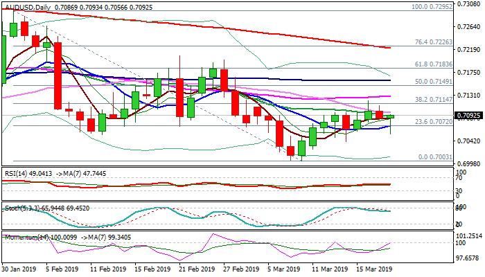 The Aussie pressures 0.7100 resistance zone (30SMA / daily Kijun-sen) following fresh bullish acceleration in Asian / European trading, driven by improved risk sentiment.