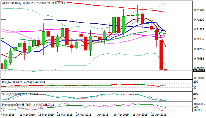 Firm break below 0.70 pivot (psychological / 8 Mar low / 50% of 0.6706/0.7295) would generate strong bearish signal for extension towards 0.6931 (Fibo 61.8%).