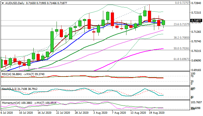 Next supports lay at 0.7135 (30DMA) and 0.7108 (12 Aug low), guarding key level at 0.7085 (Fibo 38.2% of 0.6776/0.7275) break of which would generate stronger bearish signal.