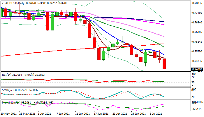 Bears pressure pivotal supports at 0.7417/13 (Fibo 23.6% of 0.5509/0.8007 rally / former top of 1 Sep 2020), with clear break here to confirm bearish signal and open way for deeper fall, which could extend towards 200WMA (0.7238) on stronger acceleration.