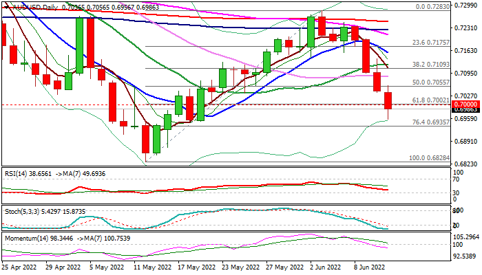 Bears look for a daily close below 0.70 handle to add to negative signals for probe through pivotal Fibo support at 0.6935 (76.4% of 0.6828/0.7283 upleg) that would open way for attack at 0.6828 (2022 low).