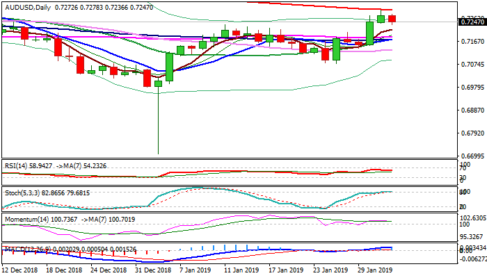 The Aussie dollar stands at the back foot in early Friday’s trading and eases from two-month high at 0.7295, posted after strong bullish acceleration on Wed/Thu on dovish Fed.