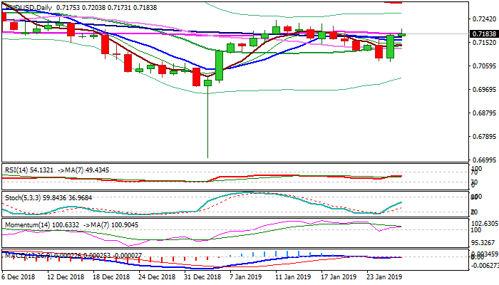 Rising bullish momentum on daily chart underpins the advance, which eyes next pivotal barrier at 0.7235 (2019 high, posted on 19 Jan / near Fibo 76.4% of 0.7393/0.6706 descend).