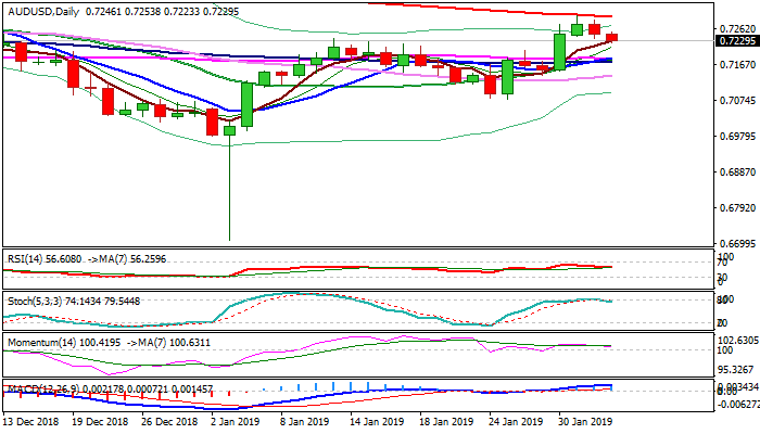 The Aussie dollar holds in red in early Monday’s trading, maintaining negative near-term tone after last week’s rejection at 200SMA (0.7293) and Friday’s bearish outside day which was negative signal.
