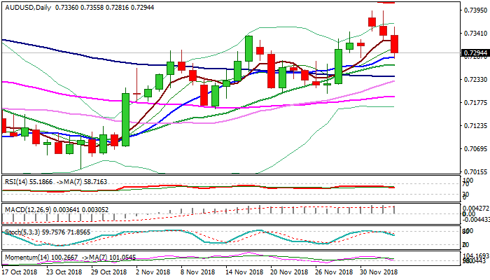 Today’s fall filled Monday’s gap, adding to negative signals, as indicators on daily chart turned south and bear-leg off 0.7393 double-top cracked rising 10SMA (0.7284).