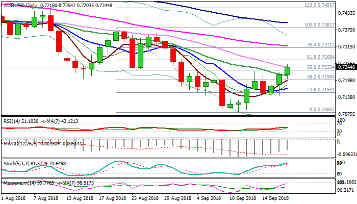 The pair holds in firm bullish mode for the third straight day and extends recovery leg from 0.7141(17 Sep trough) to probe through falling 30SMA (0.7244) and pressure key Fibo barrier at 0.7256 (61.8% of 0.7362/0.7085 descend).