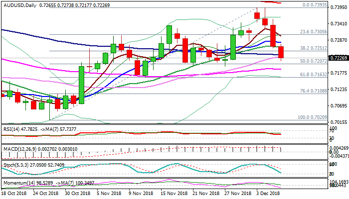 Bears extend further today, following 1% fall on Wednesday and look for test of strong supports at 0.7199/95 (27 Nov trough / daily cloud top (0.7195) and 55SMA (0.7191).