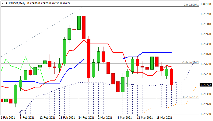 Daily chart shows moving averages (10/20/30/55) in bearish setup and rising negative momentum, as today’s eventual break of a higher base at 0.7700 zone, added to bearish signals and helped fresh weakness to penetrate rising daily cloud.