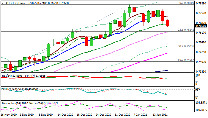Probe below 20DMA (0.7678) eyes pivotal Fibo support at 0.7624 (23.6% of 0.6991/0.7820) reinforced by rising 30DMA, close below which would open way towards next key support at 0.7503 (Fibo 38.2% of 0.6991/0.7820).