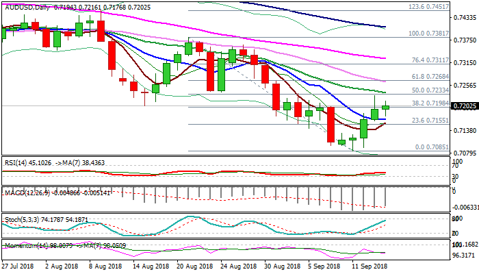 Bulls need a confirmation on close above cracked 0.7198 barrier (Fibo 38.2% of 0.7381/0.7085 descend), which would open way for extension of recovery leg from 0.7085 low towards barriers at 0.7237 (falling 20SMA) and 0.7265 (falling 30SMA).