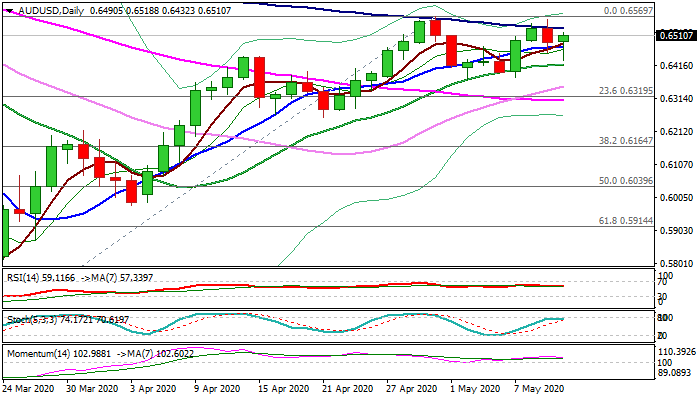 Fresh advance after repeated failure below 10DMA pressures upper pivot and eventual close above would improve the outlook and open way for test of another key barrier at 0.6569 (30 Apr high).