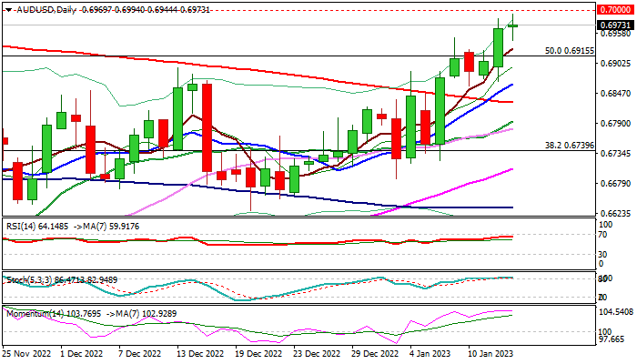 The pair is in strong uptrend for the third straight week, with break of 0.70 pivot to add to bullish signals as recent acceleration broke above 50% retracement of 0.7661/0.6170 fall.