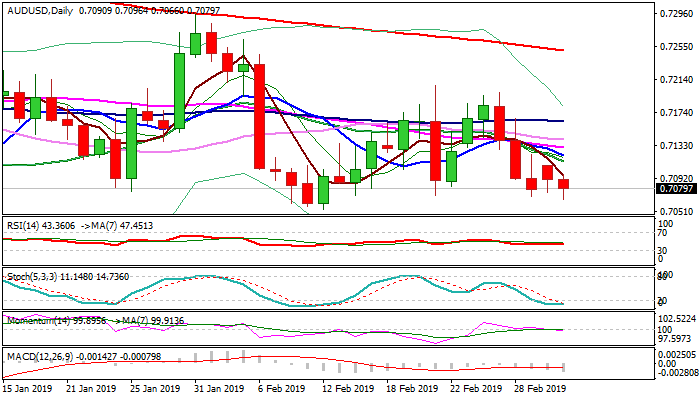 Pessimistic tones prevail in the market, keeping the pair at the back foot and pressuring pivotal support at 0.7070 (Fibo 38.2% of 0.6706/0.7295), already cracked on overnight’s dip to 0.7066, with nervous choppy trading expected to remain until Wednesday’s release.