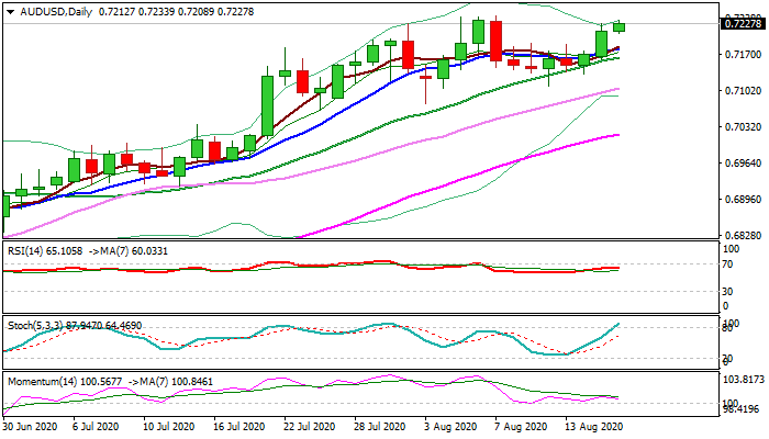 The Australian dollar extends gains into third straight day and pressures 7 Aug high at 0.7243 (the highest since early Feb 2019) boosted by weaker dollar and barely affected by China’s anti-dumping probe into imports of Australian wine.